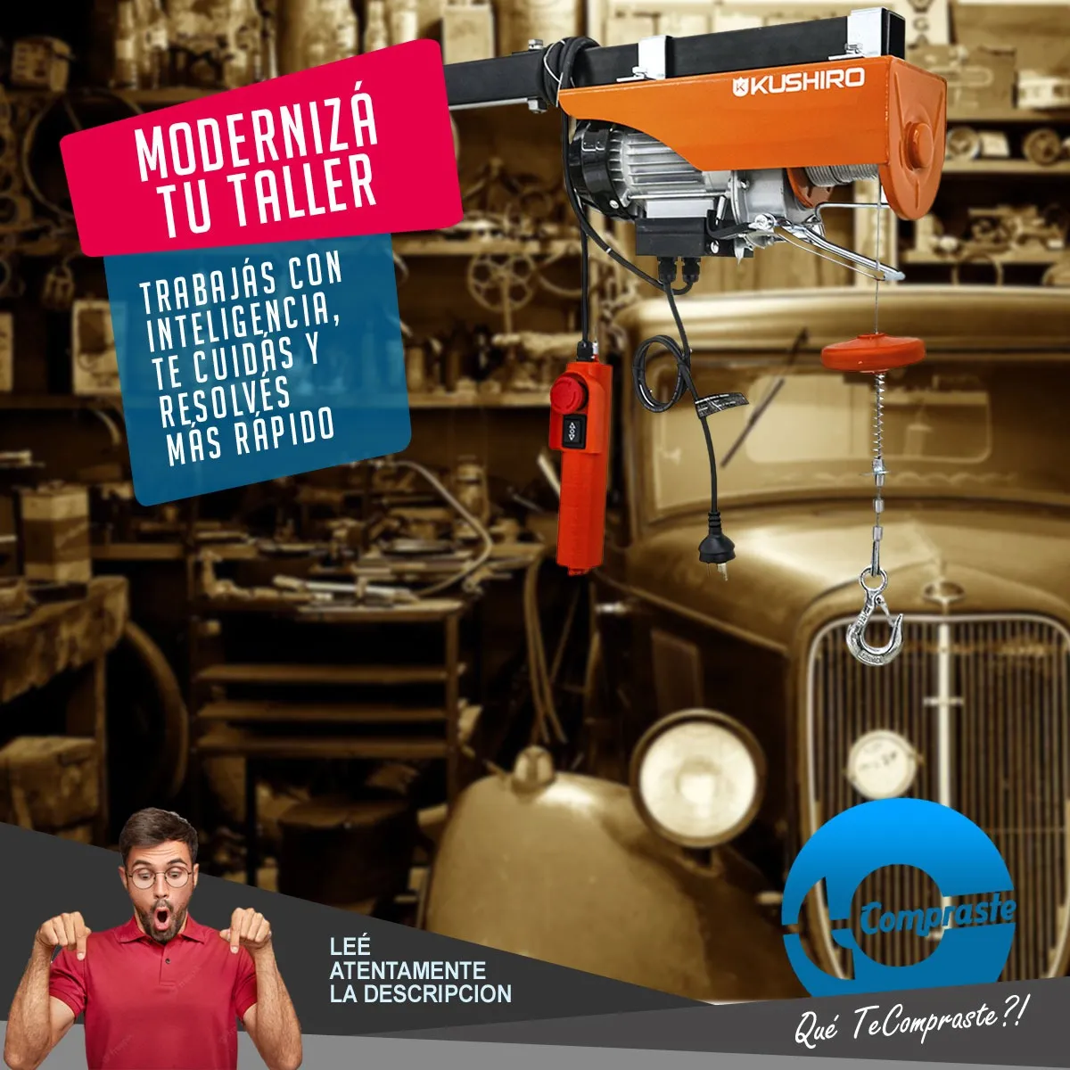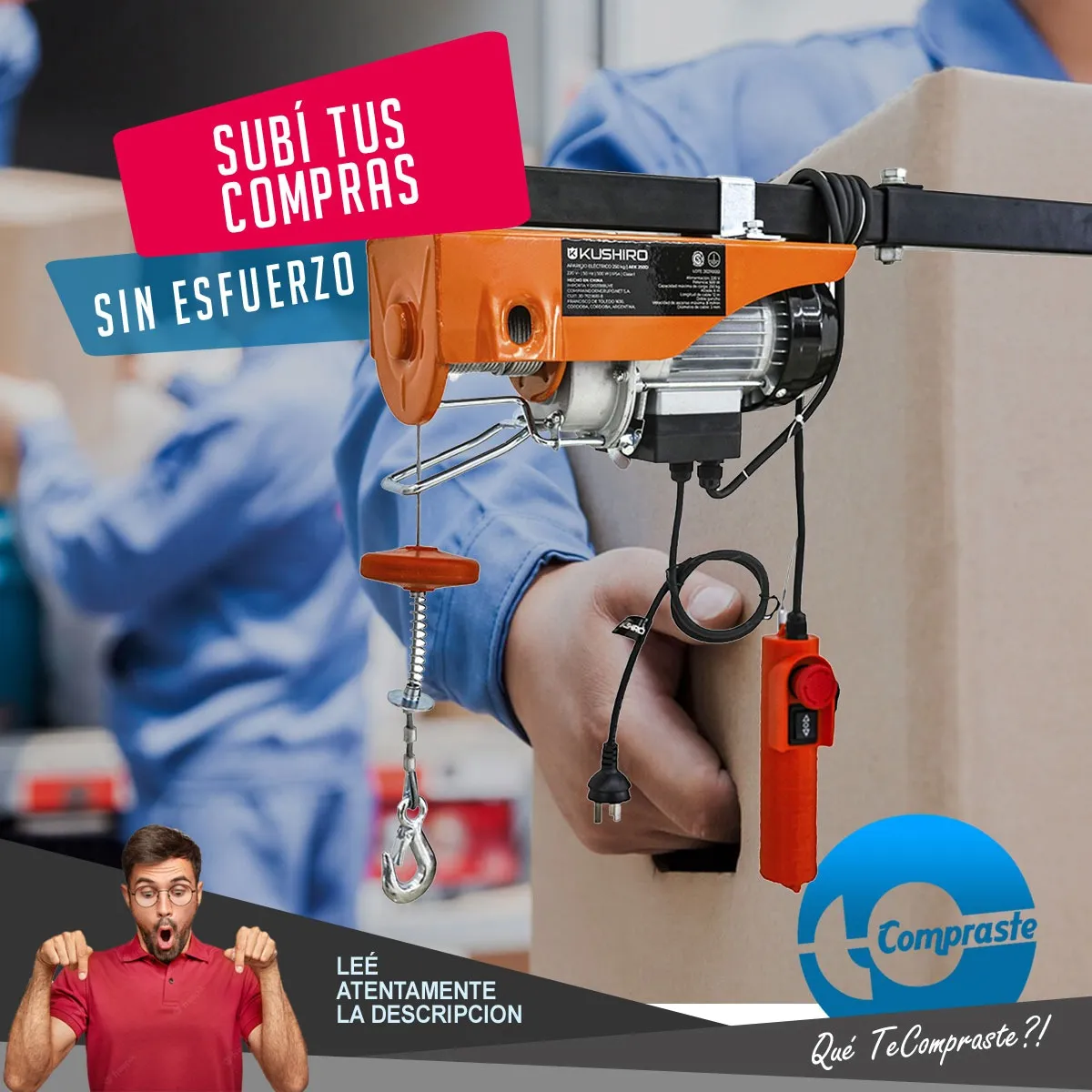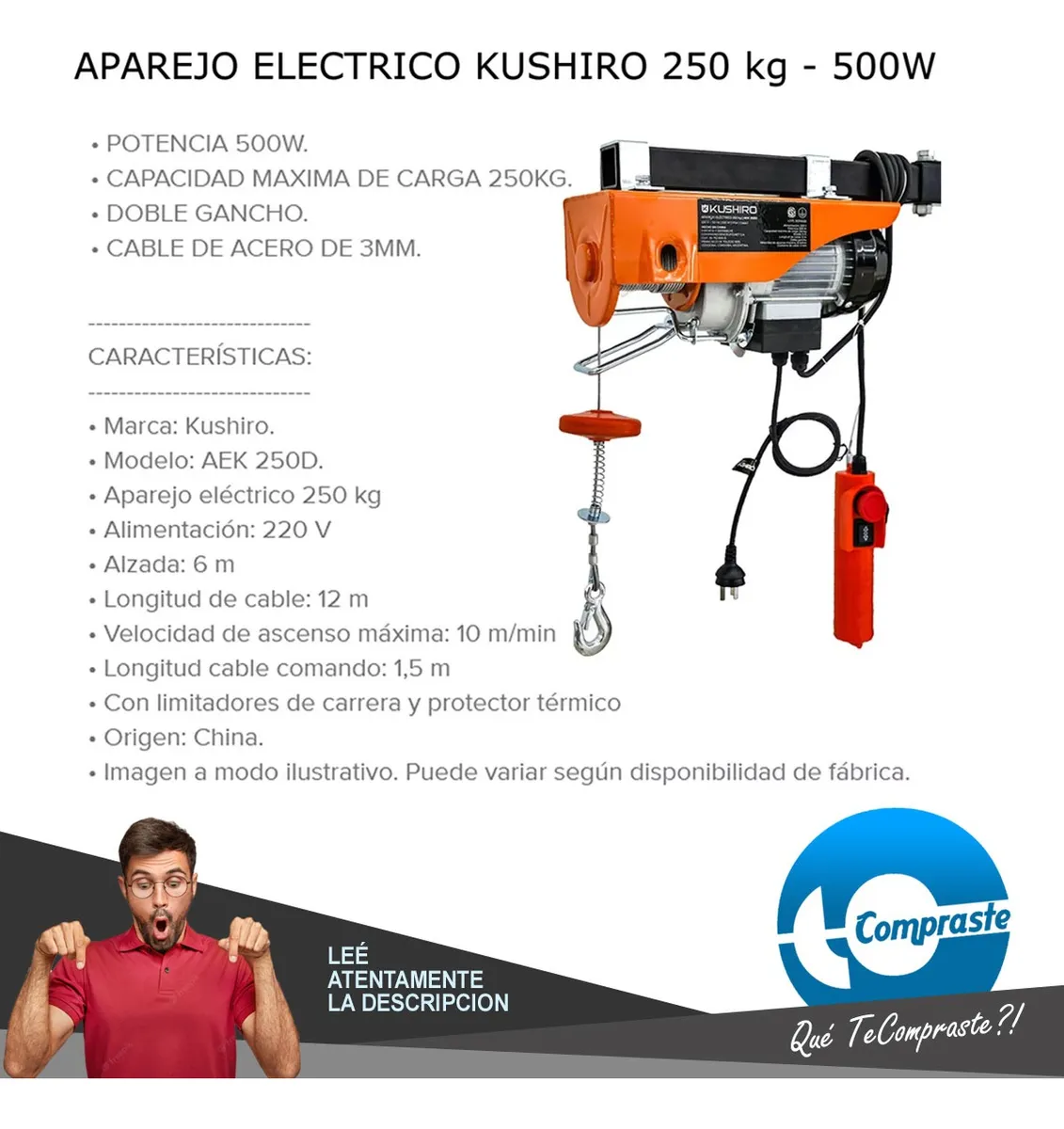 El aparejo eléctrico Kushiro AEK 250D es el aliado perfecto para levantar cargas pesadas de manera segura y sin esfuerzo. Su potencia de 500W y capacidad de hasta 250 kg lo convierten en una herramienta indispensable para talleres, obras, galpones y hasta para uso doméstico cuando las cosas se ponen pesadas.