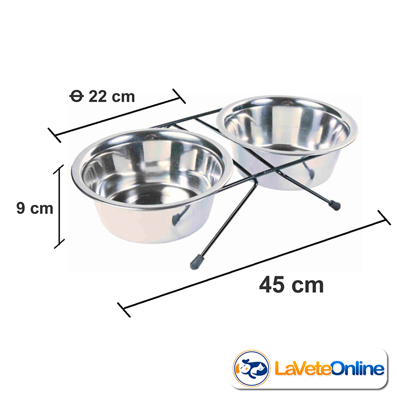 Comedero doble estilo cazuelas con base de metal. Cada cazuela tiene una capacidad de 1600 ml y un diametro de 22 cm. Ideal para perros medianos a grandes.