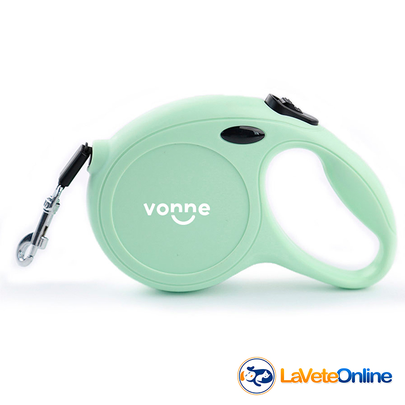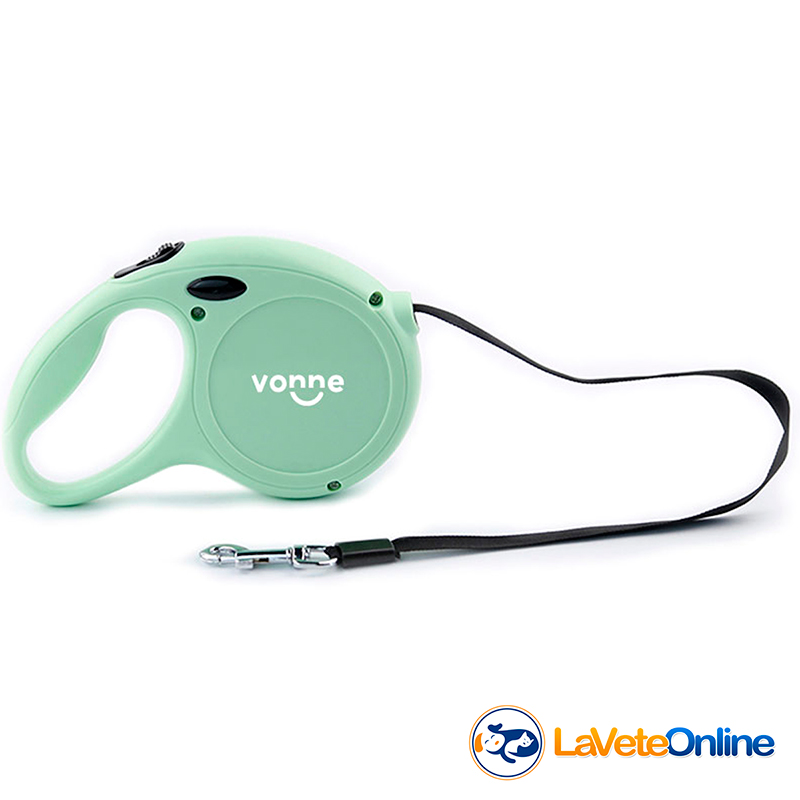 Correa de cinta de poliester con sistema retractil incluye boton de frenado y traba. Comoda y apta para perros de hasta 25 kg.
