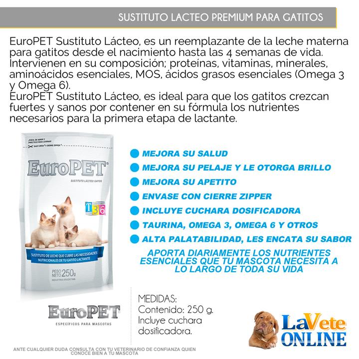 EuroPET Sustituto Lacteo, es un reemplazante de la leche materna para gatitos desde el nacimiento hasta las 4 semanas de vida.