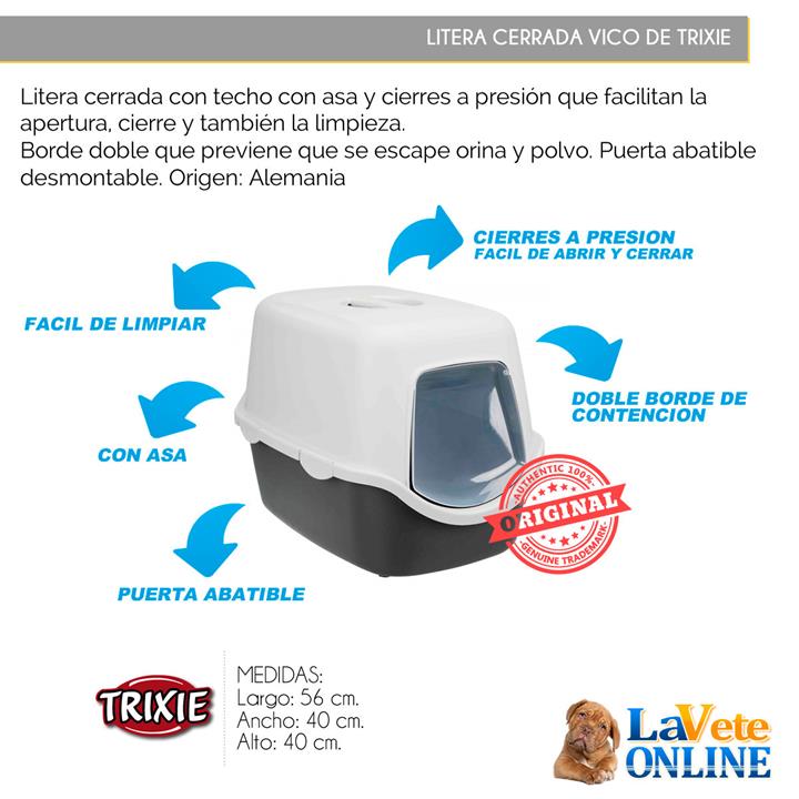 Litera cerrada con techo con asa y cierres a presion que facilitan la apertura, cierre y tambien la limpieza. Borde doble que previene que se escape orina y polvo. Puerta abatible desmontable. Origen: Alemania